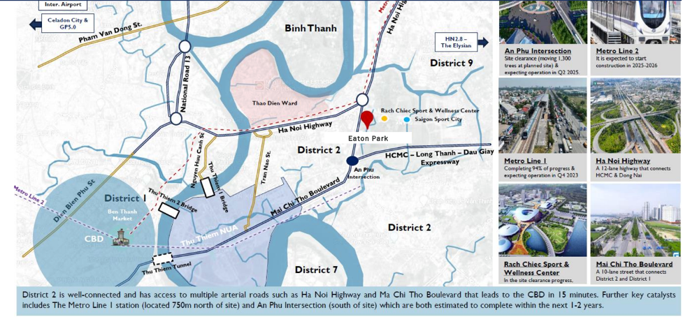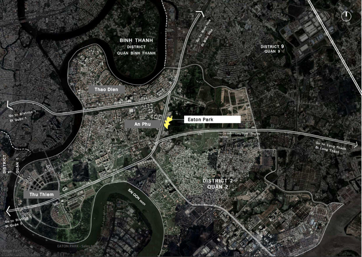 Eaton Park năm tại vị trí “vàng” phía Đông thành phố, nằm giữa ba tuyến đường lớn nhất TP Thủ Đức là Mai Chí Thọ, xa lộ Hà Nội và cao tốc TP.HCM – Long Thành – Dầu Giây, và cách nút giao An Phú vỏn vẹn 450m.