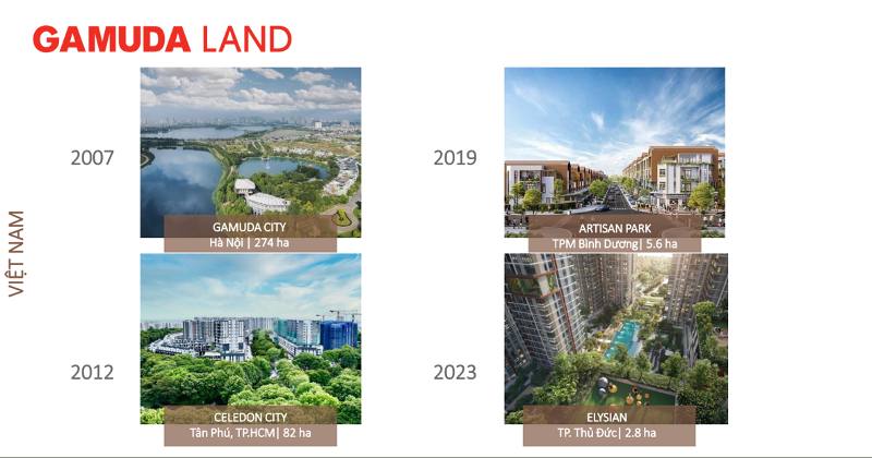 Gia nhập vào thị trường Việt Nam từ 2007, Gamuda Land đã ghi dấu ấn bằng các dự án tiêu biểu như Gamuda City ở Hà Nội, Caleton City ở Tp HCM,… Gamuda Land được đánh giá là một trong những nhà phát triển bất động sản uy tín hàng đầu tại Việt Nam.