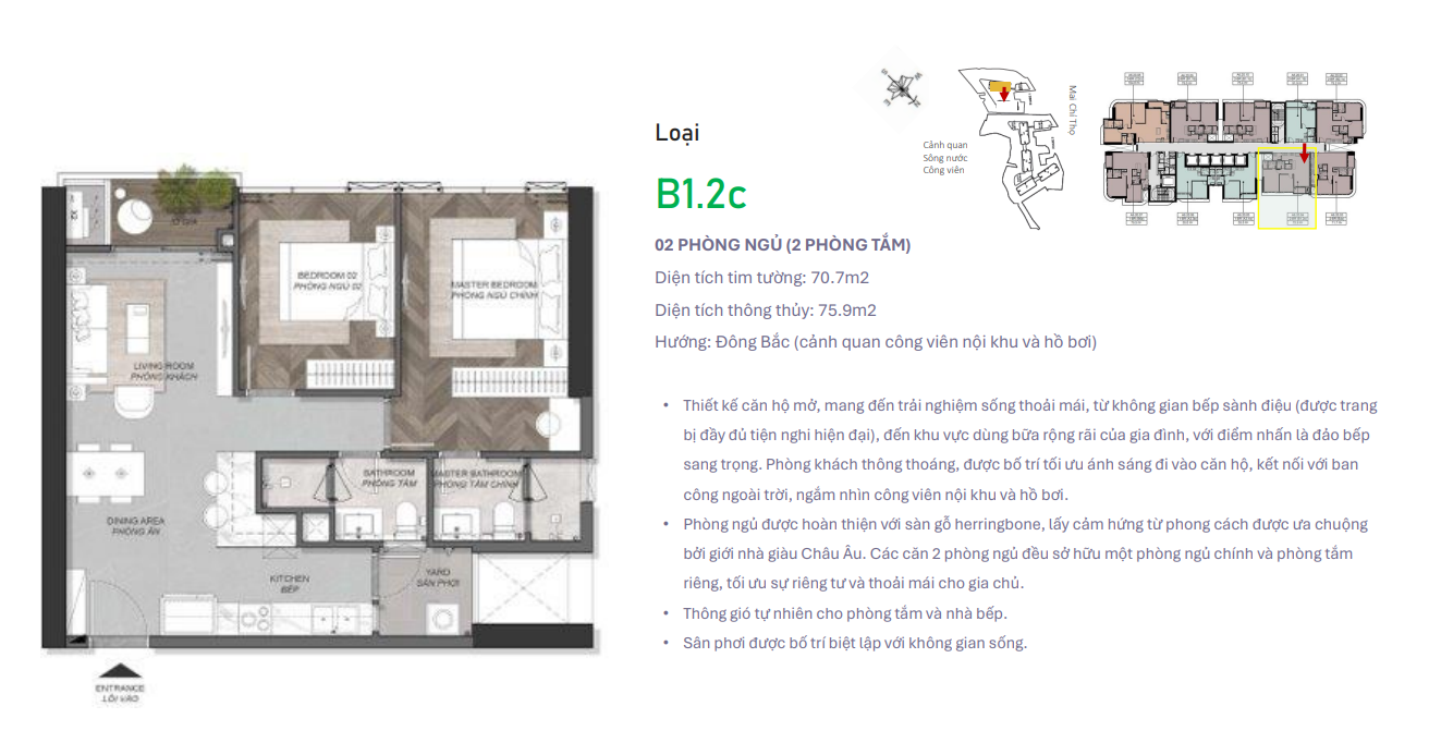 – 1980 căn hộ, 20 căn Shophouse, 52 căn shop – Căn hộ 1PN diện tích: 46m2 – Căn hộ 2PN diện tích: 69-70m2 – Căn hộ 3PN diện tích: 97m2 – Dupplex và duel key diện tích: 105m2 – Penhouse diện tích: 196m2 |