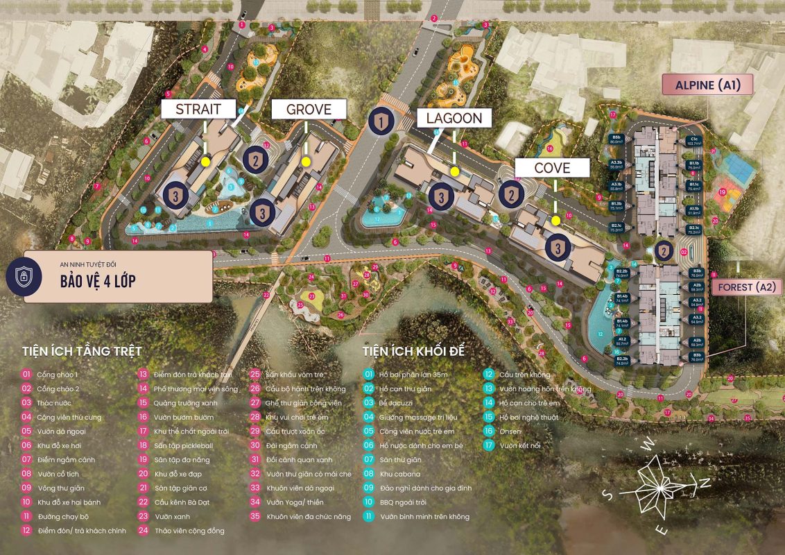 Khối đế: 2 tầng – 37 căn shop tại Khối đế – 15 căn shophouse (tổ hợp 15 căn hộ & 15 shops) Tòa Tháp: 27-37 tầng – Tháp A1: cao 36 tầng gồm 342 căn hộ – Tháp A2: cao 27 tầng gồm 280 căn hộ – Tháp A3: cao 37 tầng gồm 343 căn hộ – Tháp A4: cao 37 tầng gồm 342 căn hộ |