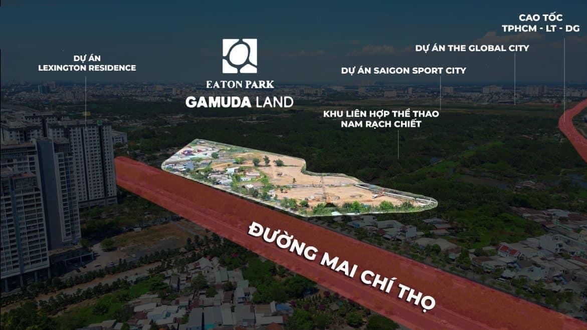 Dự án Eaton Park có vị trí chính xác ngay mặt tiền Mai Chí Thọ, Phường An Phú, TP Thủ Đức, TP Hồ Chí Minh cách Thủ Thiêm chỉ 10 phút di chuyển, cách Thảo Điền 10 phút và cách khu trung tâm mới New Downtown The Global City chỉ 5 phút. Ranh giới tiếp giáp của dự án Gamuda Quận 2 như sau: