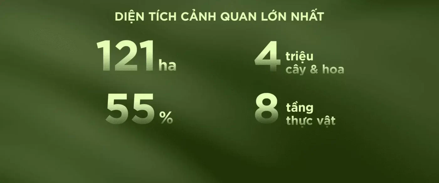 Toàn bộ khu đô thị được bao phủ bởi hệ sinh thái thực vật phong phú với 8 tầng thực vật đa dạng cùng hơn 4 triệu cây xanh và hoa, trải rộng trên 121 hecta cảnh quan – chiếm tới 55% tổng diện tích dự án. Không chỉ là mảng xanh đơn thuần, đây là một hệ thống sinh thái sống động, góp phần điều hòa khí hậu và nuôi dưỡng sức khỏe cư dân.